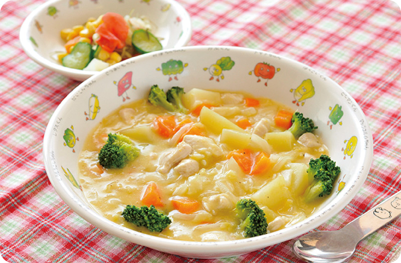 牛乳を豆乳に、小麦粉を米粉に、バターをショートニングにチェンジ!コーンクリームと鶏がらスープを加えたら、まろやか〜なコクがでて大好評でした。