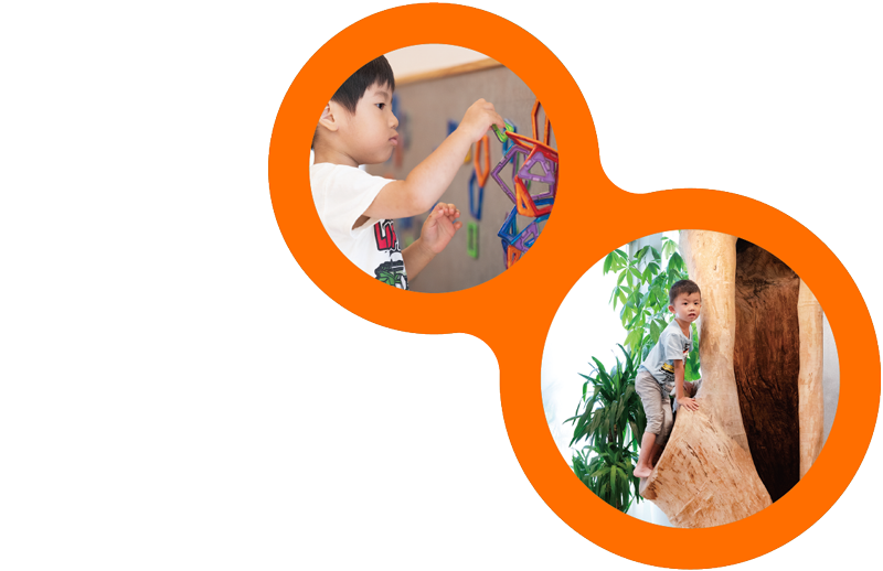 自由に組み合わせられる、遊具と家具はオリジナル。机にもなる多機能イスや、ロッカーなどの家具は簡単に移動できます。